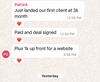You’re not doing this alone. Join a community of agency owners who meet multiple times per week for live calls, collaboration, and accountability. Outside the calls, the group stays active, sharing wins, breaking down challenges, and pushing each other forward. You get continuous support from people building alongside you.
